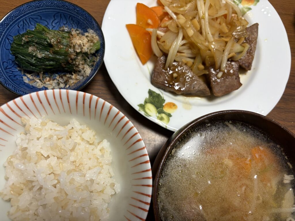 副菜にほうれん草のお浸しと、汁物は残り物の豚汁です。